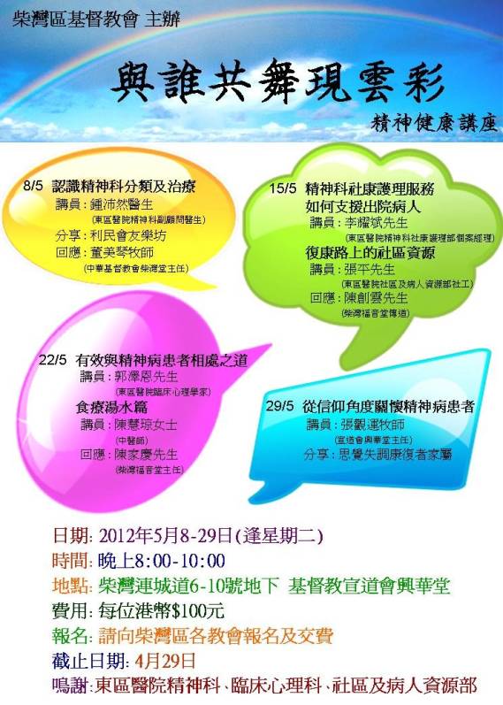 22/5「有效與精神病患者相處之道」 講員:郭澤恩先生(東區醫院臨床心理學家) 「食療湯水篇」 講員:陳慧琼女士(中醫師) 回應:陳家慶先生(柴灣福音堂主任) |
