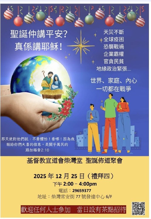 12 月20 日(六)下午4:00-5:00 進行街頭佈道(地點為信愛小學對出),誠邀會眾參與佈道、與人分享福音。
